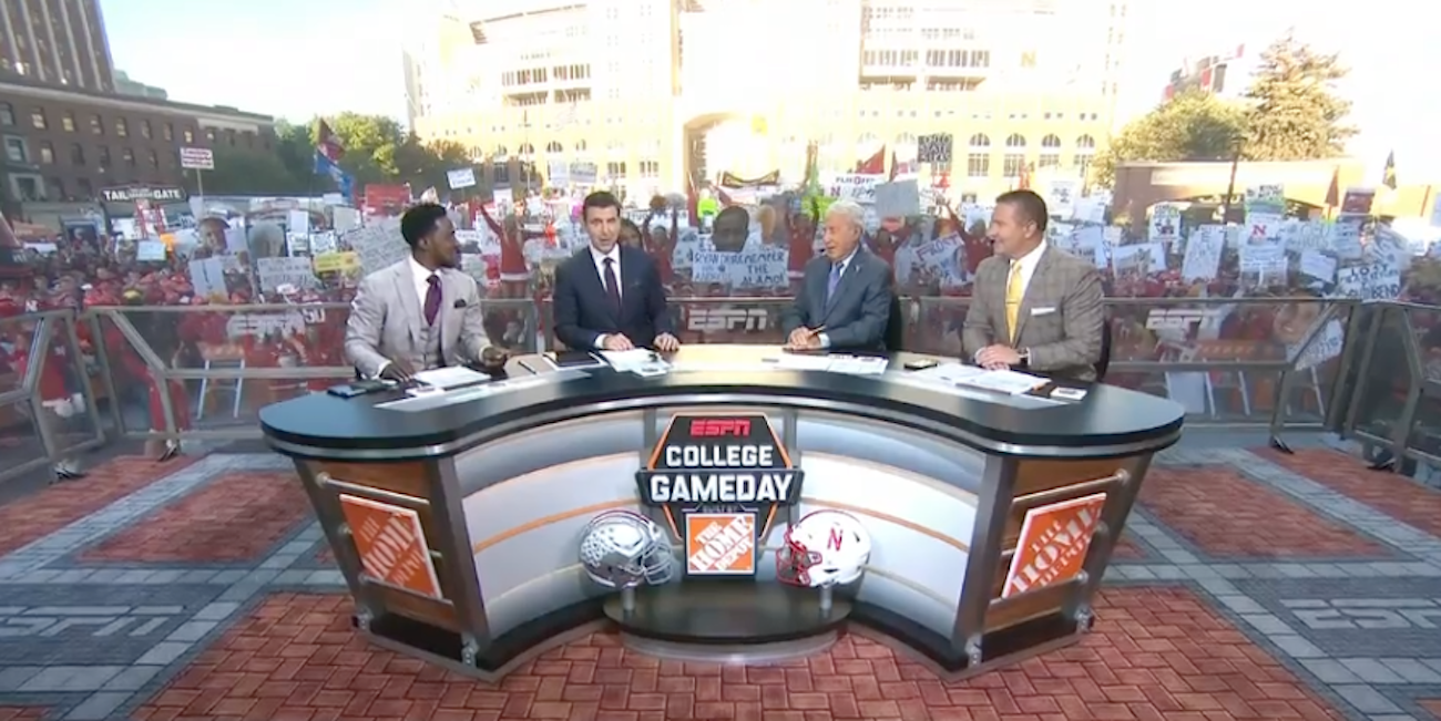 Lee Corso gets ready for headgear segment on College GameDay, tells Kirk Herbstreit, ‘Don’t screw it up’