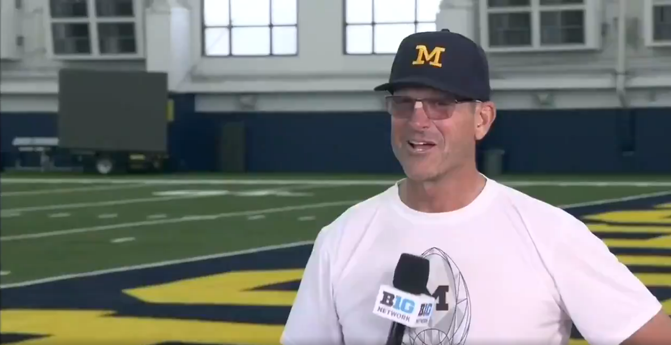 Tough sleddin’: Jim Harbaugh was winded for BTN’s interview after team workout